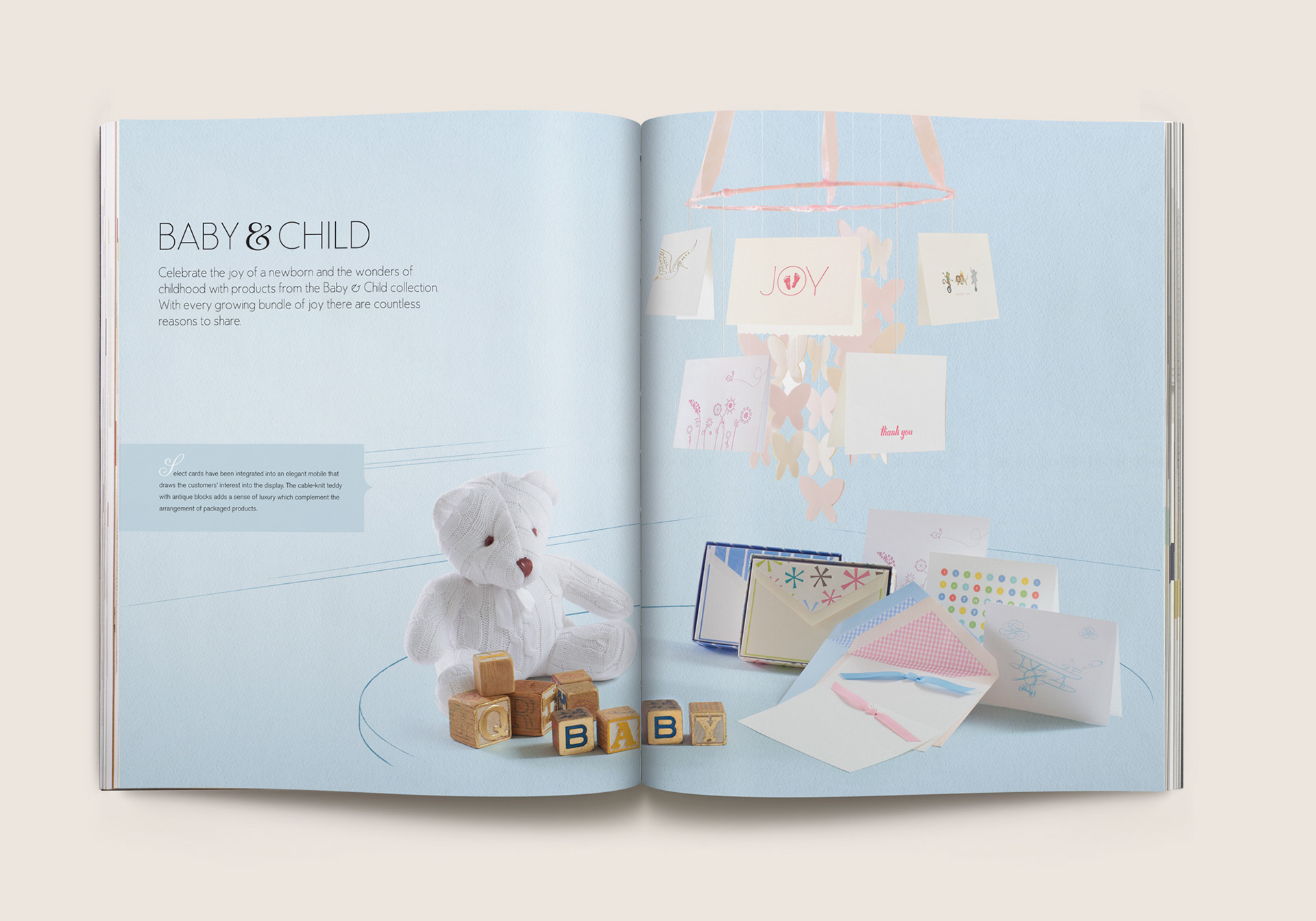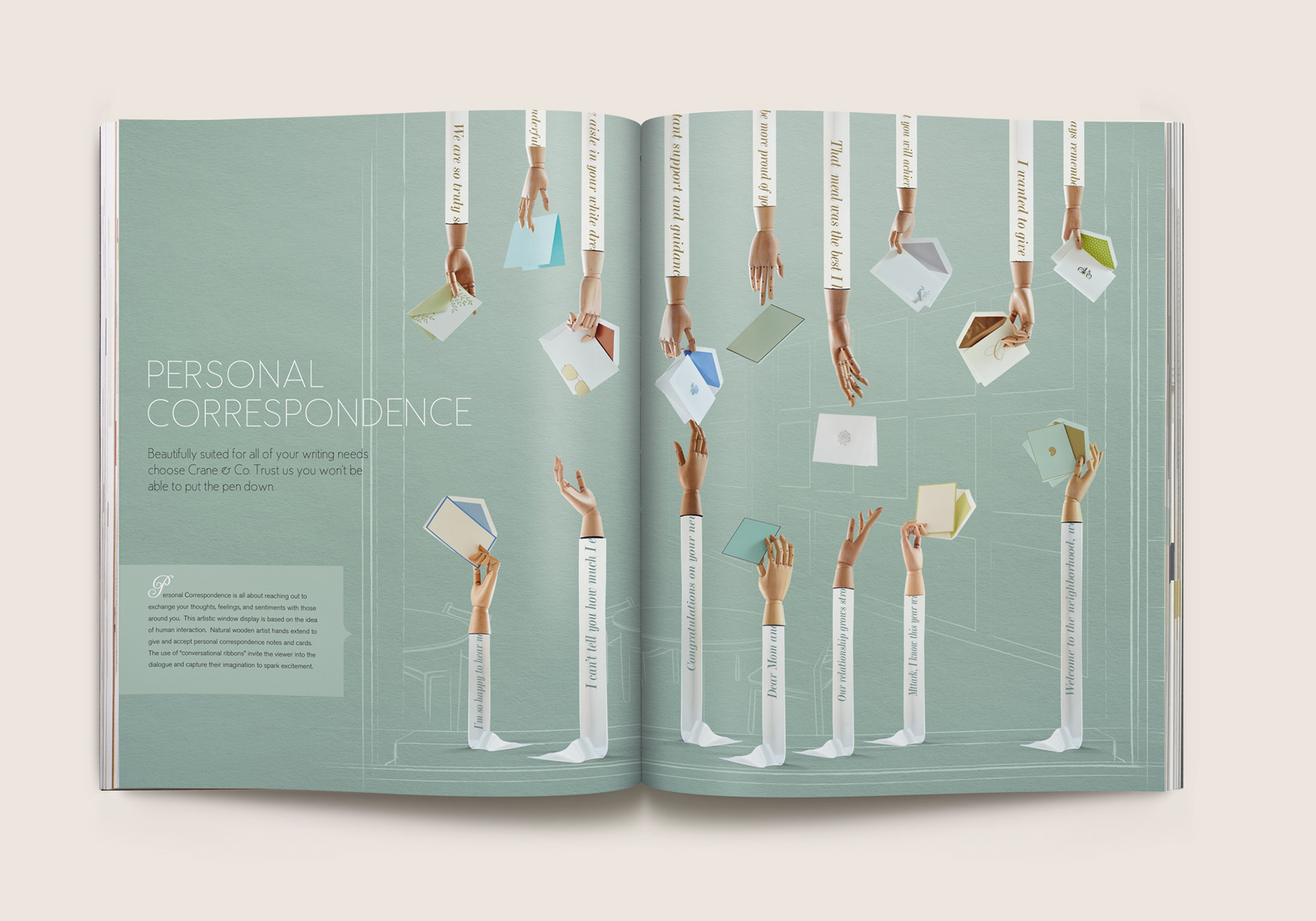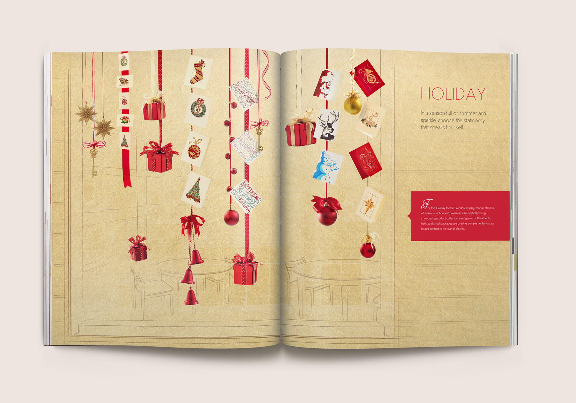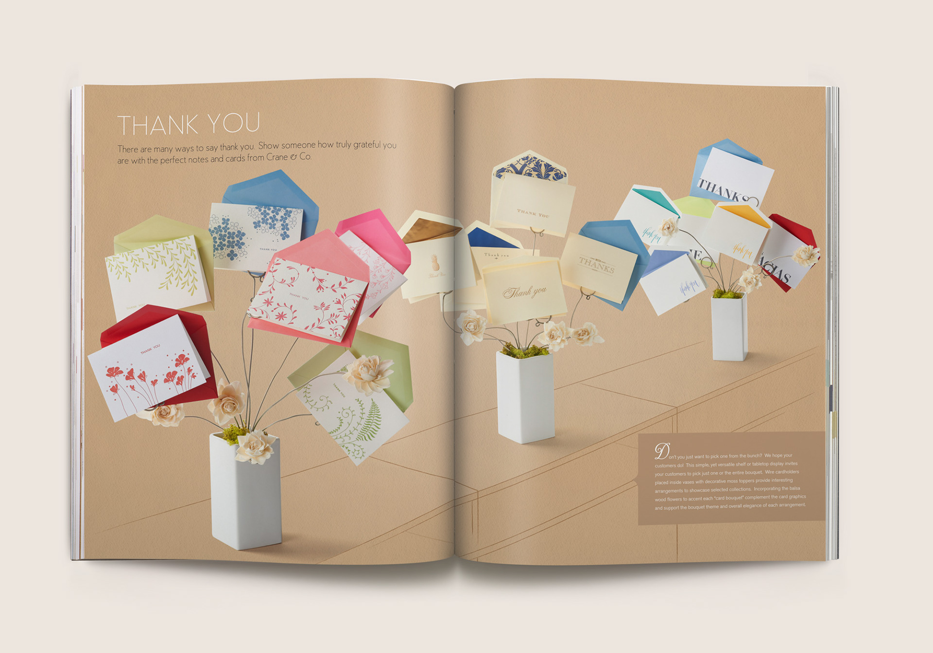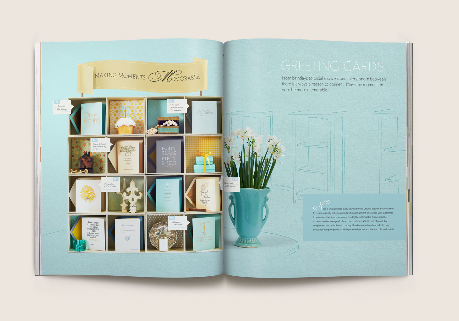 Eleven category spreads were created depicting retail merchandising display scenes. From card ‘bouquet’ arrangements to card mobiles that replicate a child’s nursery, photographic still lifes were composited utilizing subtle sketches depicting the contextual environment, using actual Crane paper as the backdrop. Each of these spreads inspire and guide store owners to create settings like these that draw their consumers’ attention in unique and creative ways.