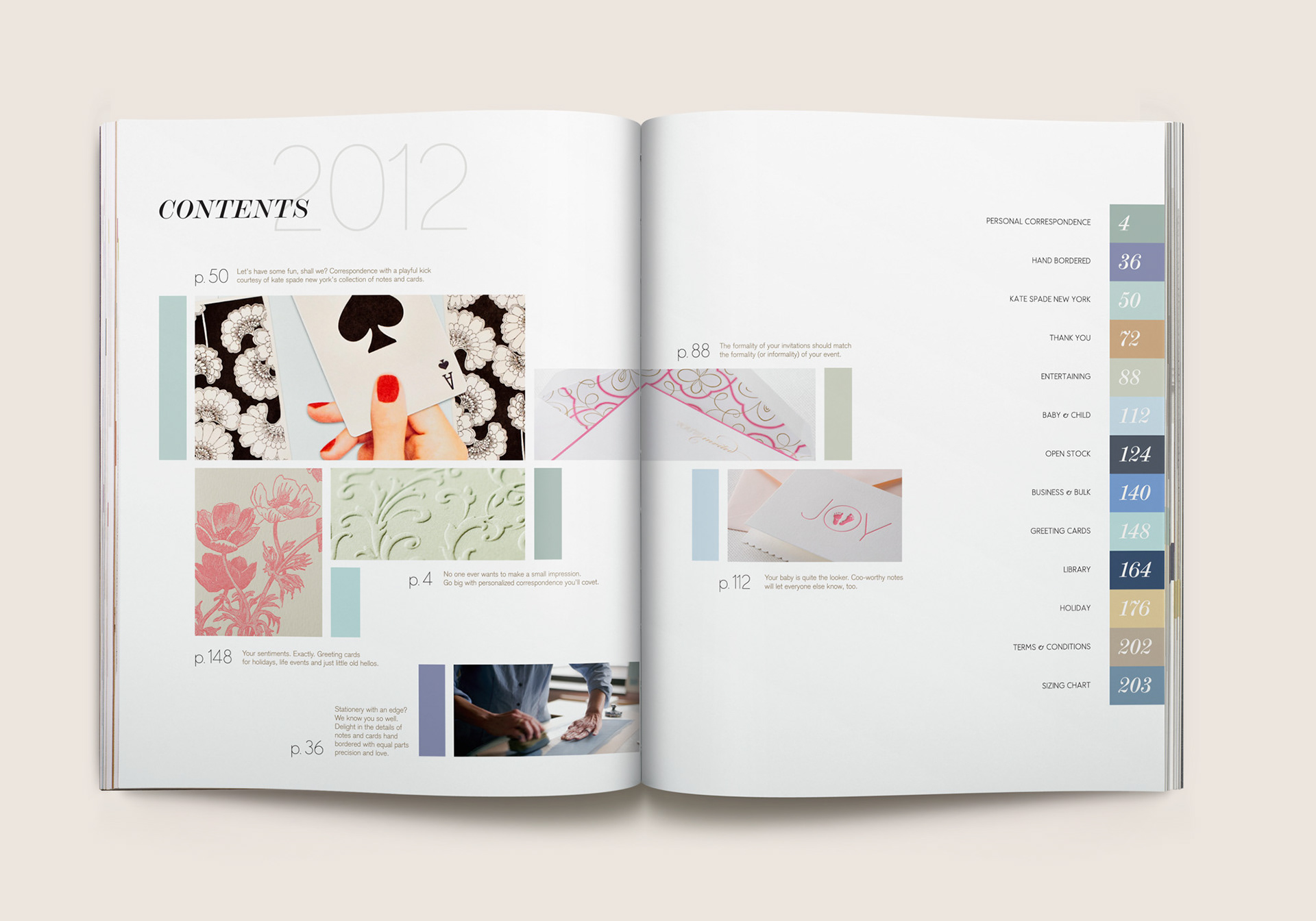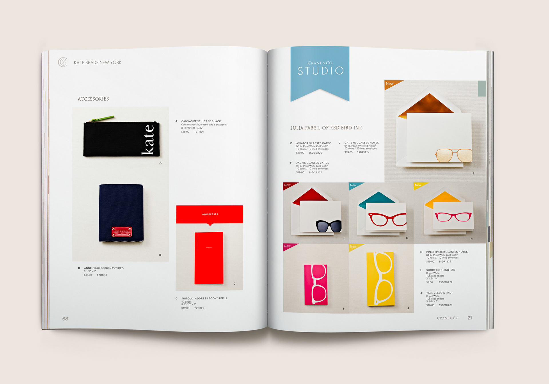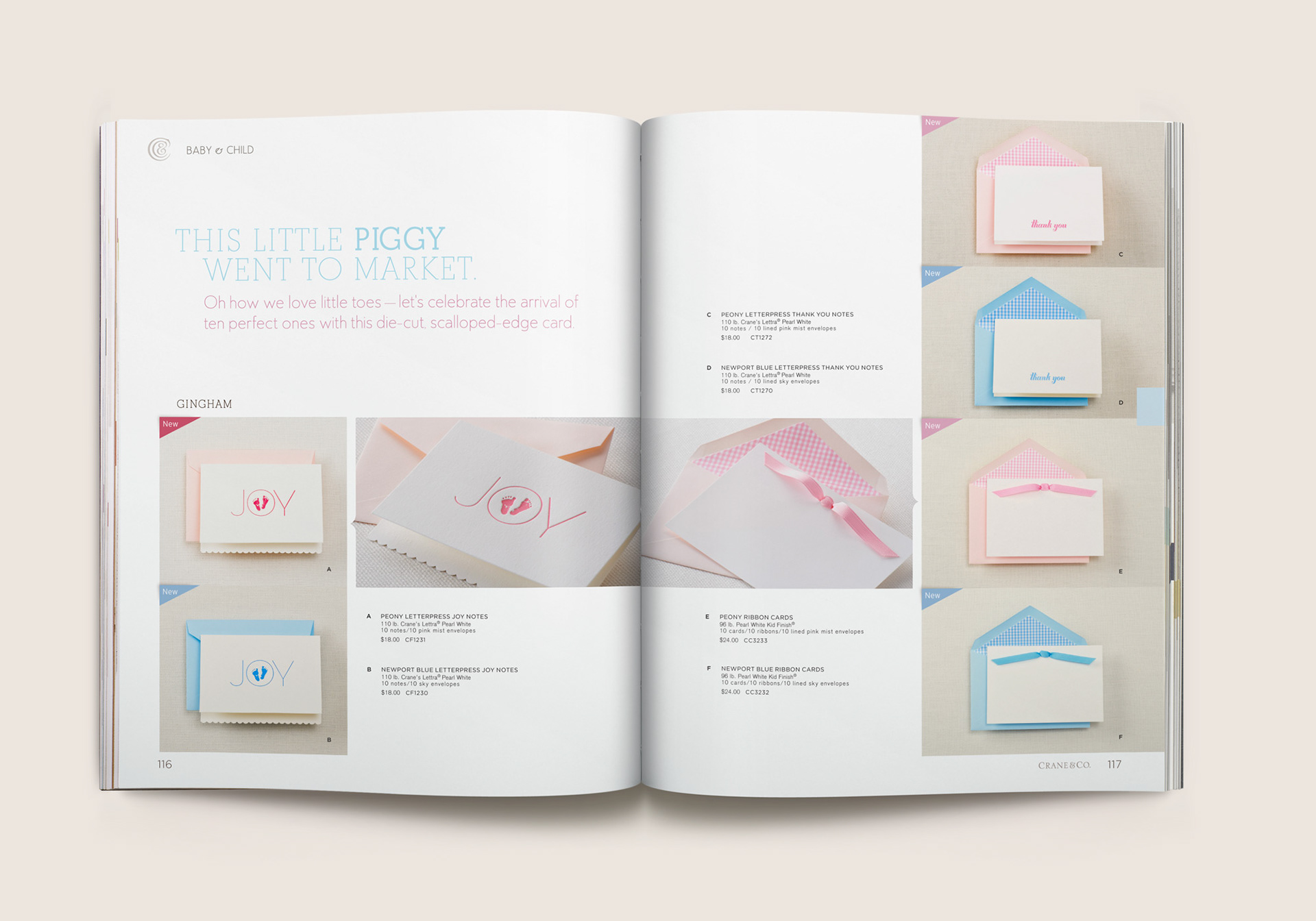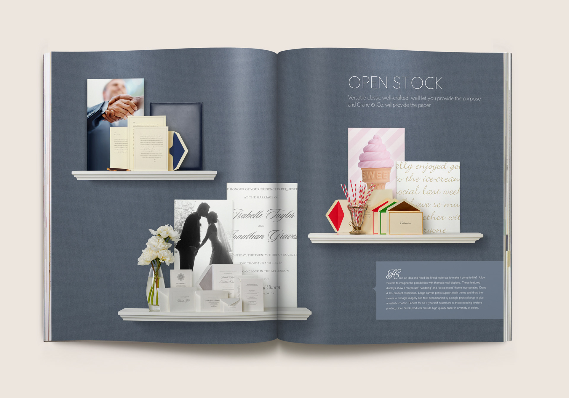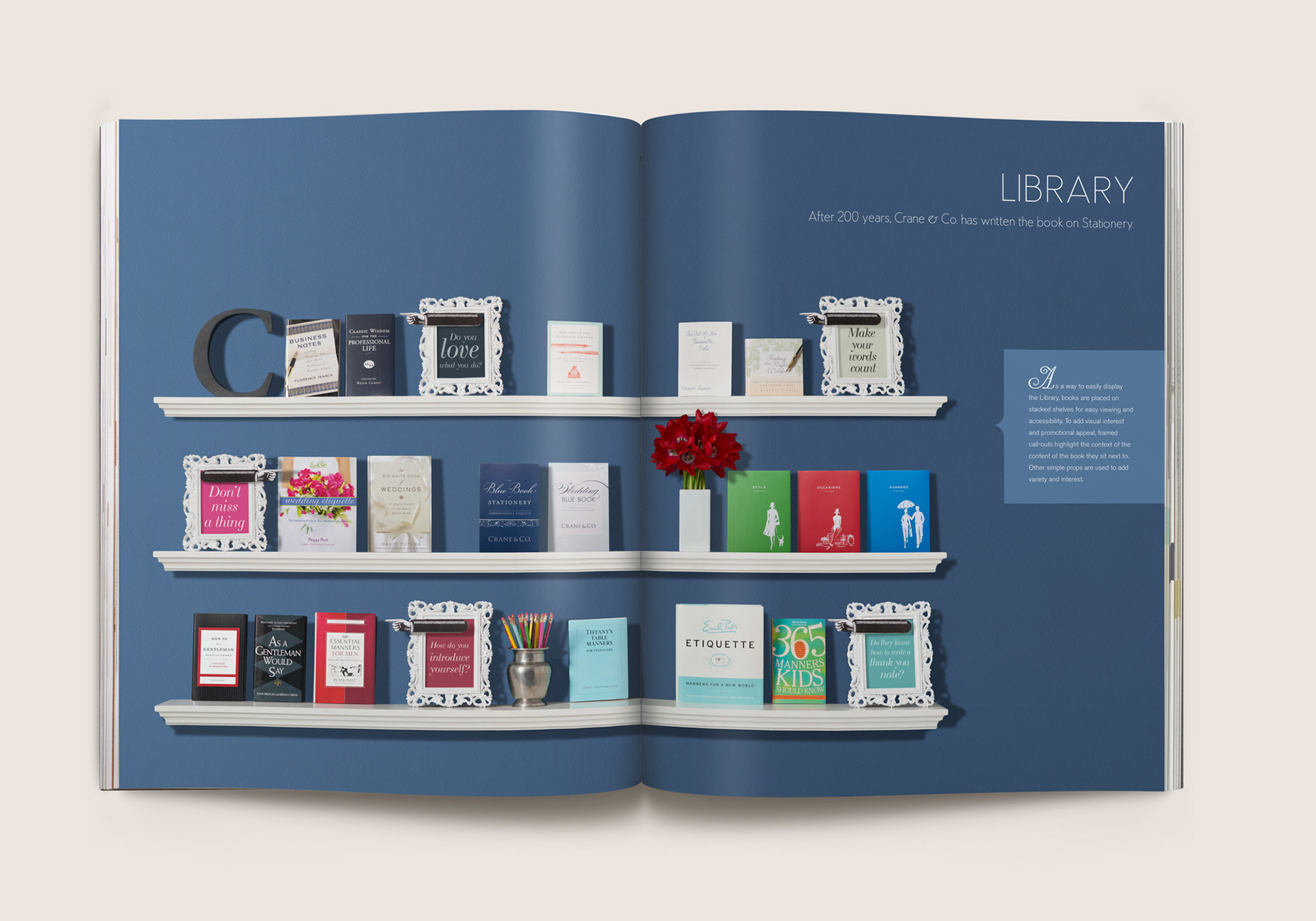 Eleven category spreads were created depicting retail merchandising display scenes. From card ‘bouquet’ arrangements to card mobiles that replicate a child’s nursery, photographic still lifes were composited utilizing subtle sketches depicting the contextual environment, using actual Crane paper as the backdrop. Each of these spreads inspire and guide store owners to create settings like these that draw their consumers’ attention in unique and creative ways.