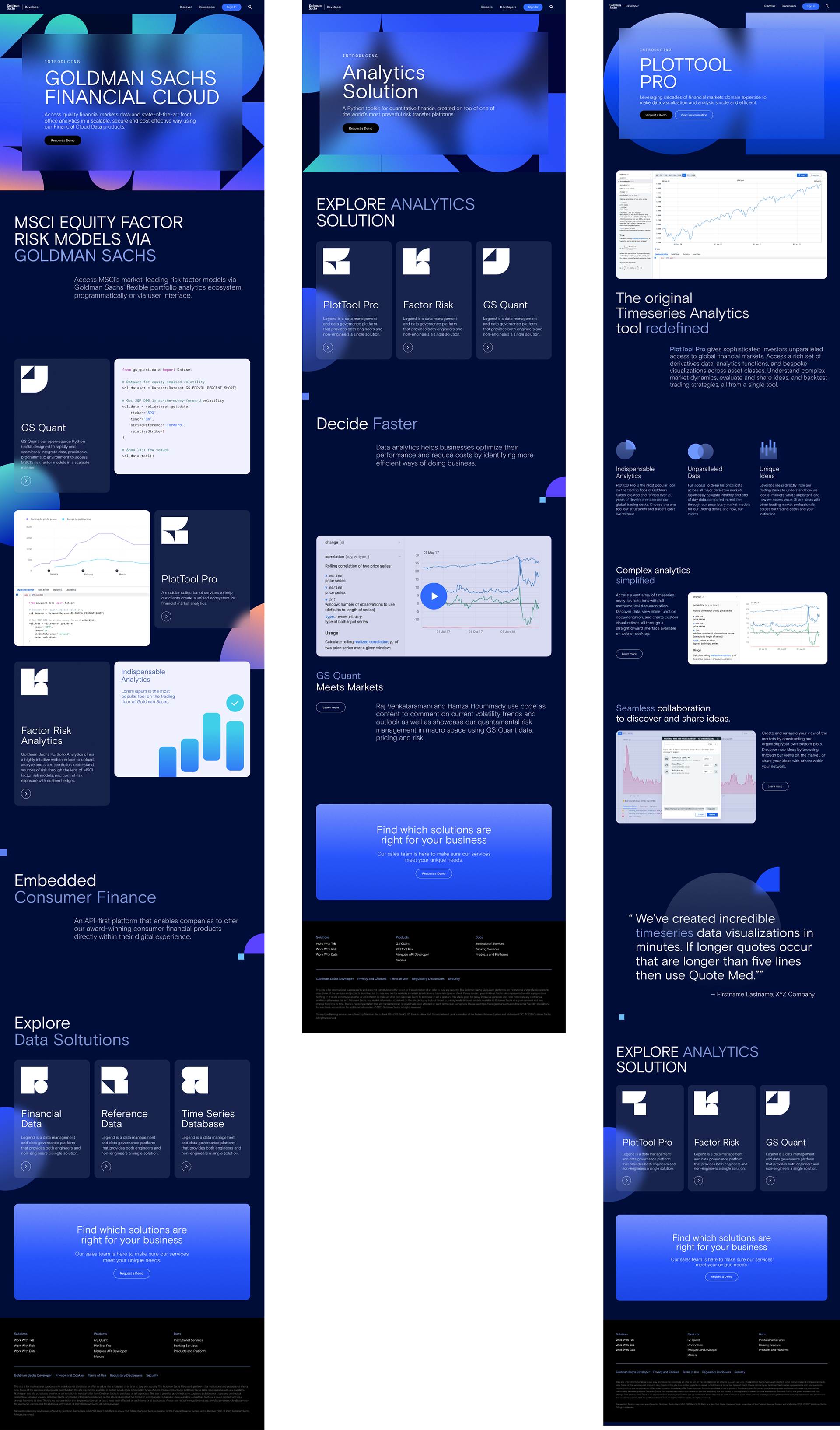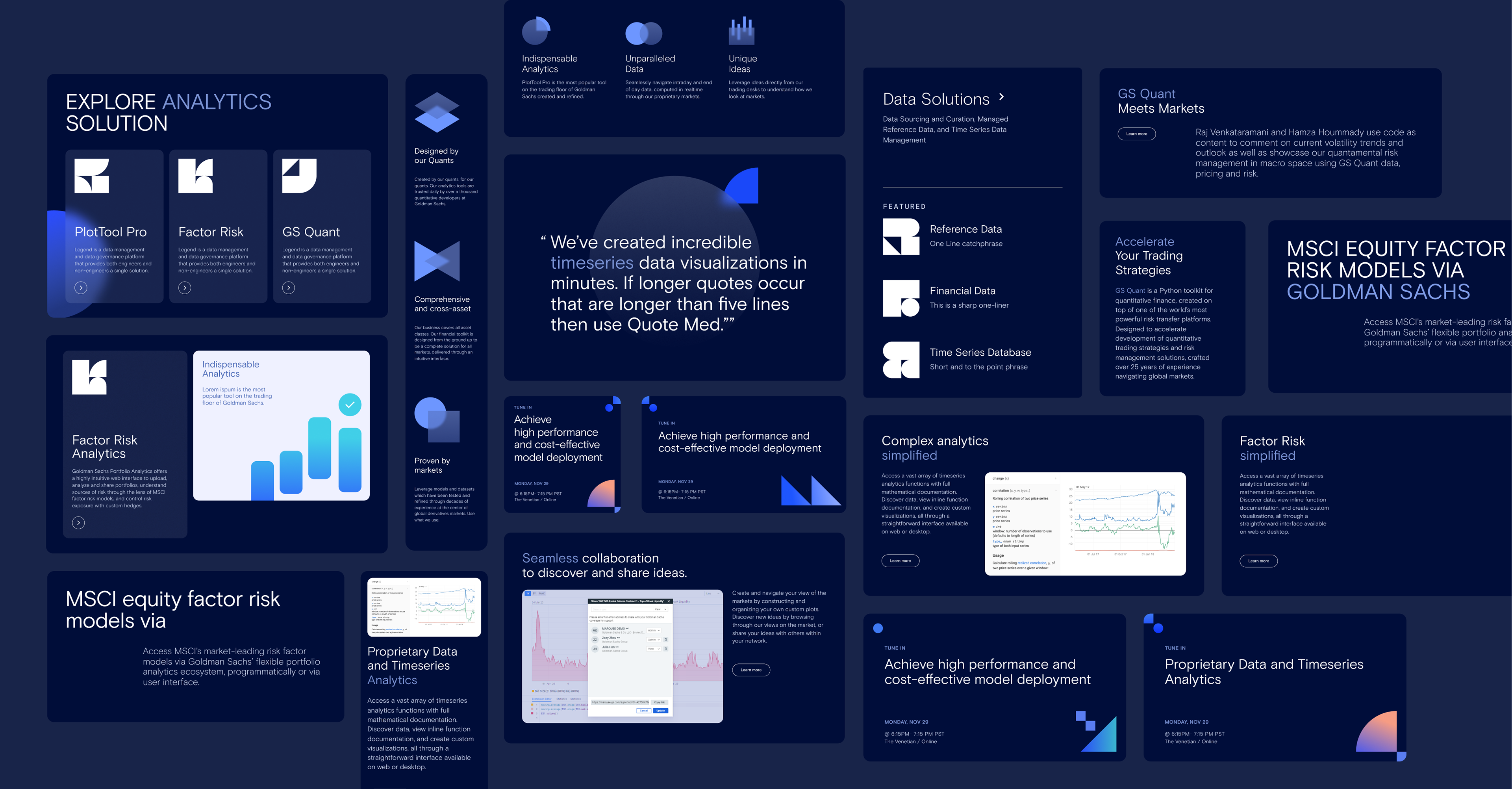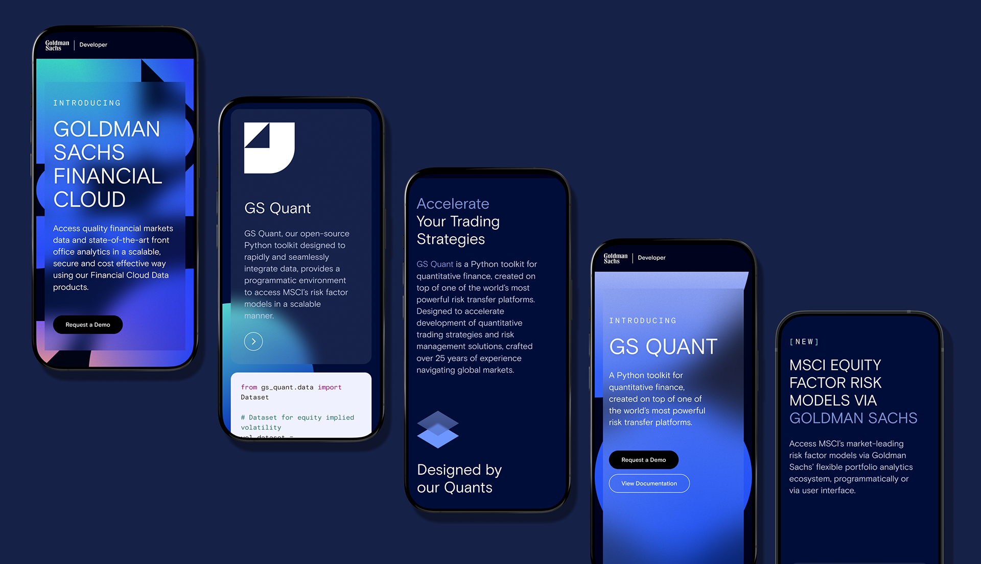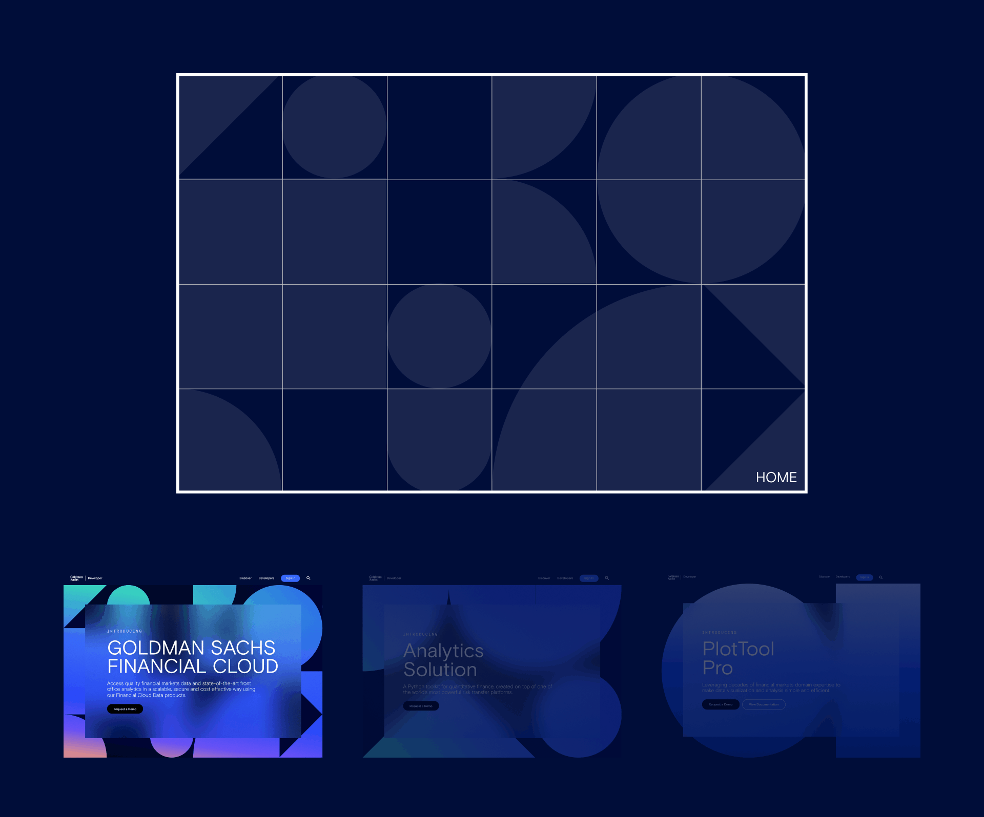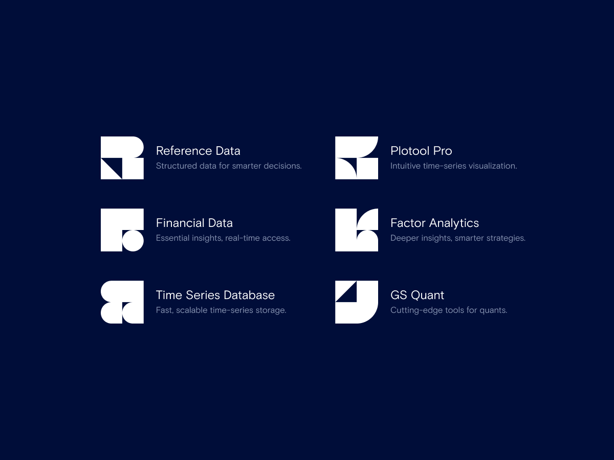 Goldman Sachs Financial Cloud needed an identity system as powerful and flexible as the platform itself—one that would set a new standard for developer experiences while remaining deeply rooted in the brand’s heritage. The solution: a dynamic, scalable system built from the foundational square of the primary identity, deconstructed into simple, adaptable shapes. This modular approach reflects the versatility, precision, and solutions-driven nature of the Financial Cloud, ensuring a cohesive yet flexible look across products, solutions, and marketing channels. The result is an ownable, visually striking system that reinforces Goldman Sachs’ legacy while driving innovation forward.