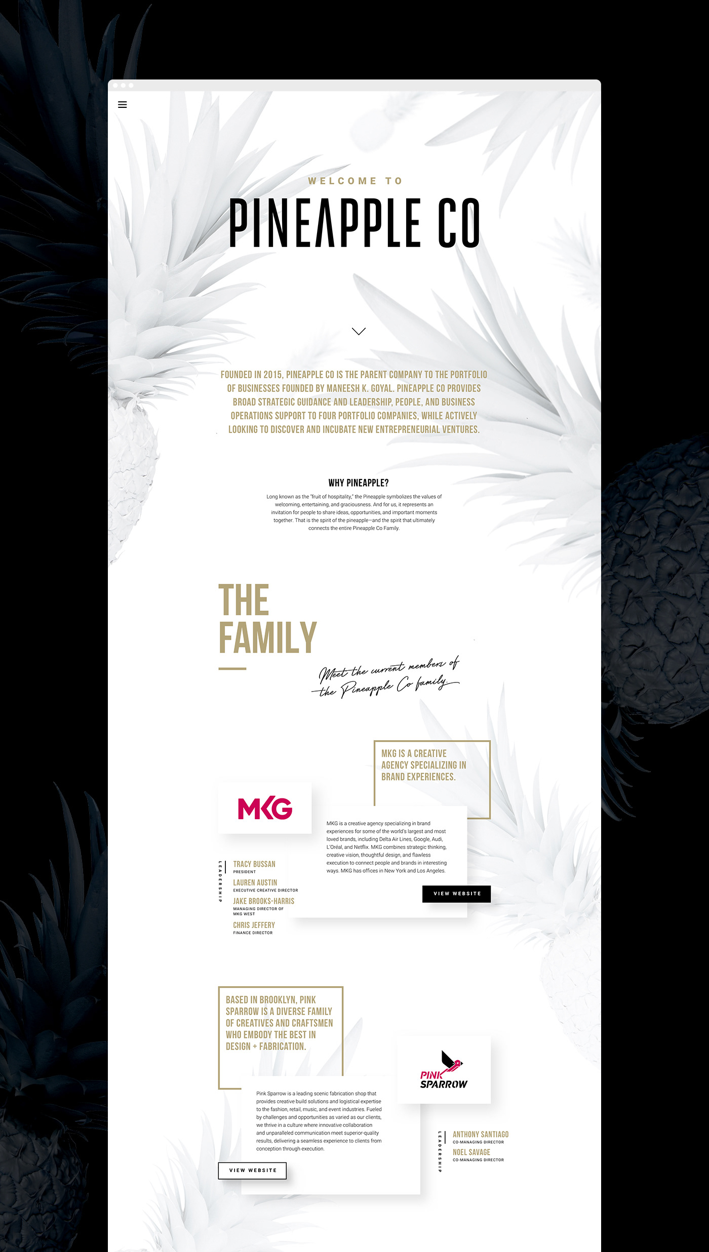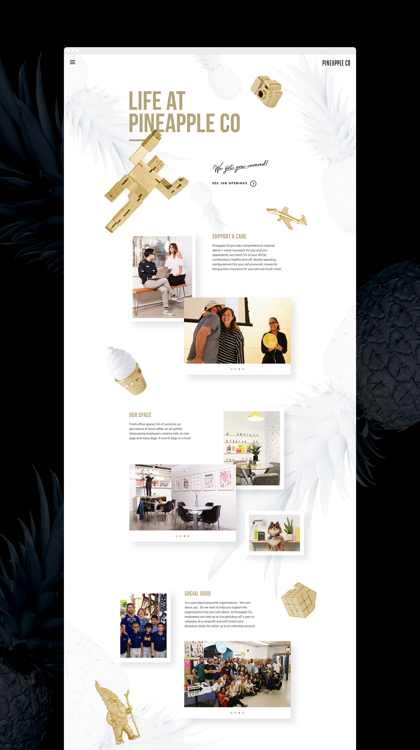 Pineapple Co needed a website to showcase not only its crucial roles as a parent company, but also to flaunt its own personality (and hold its own in such a cool group). Utilizing a clean, white & gold color palette brought an element of sophistication to the design, while incorporating gold playful objects reinforced Pineapple Co’s youthful personality and charm, highlighting their people-focused mission without losing their signature dazzle.
