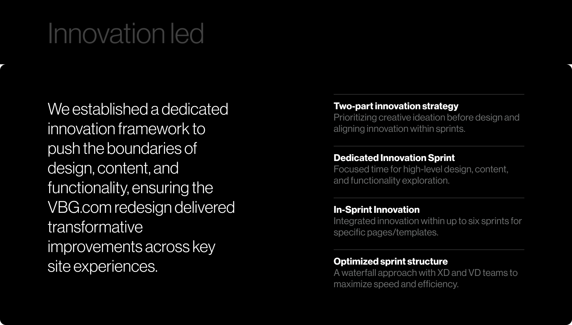 With over 40 million visits per year, Verizon’s business site is a critical touchpoint for business owners navigating Verizon’s robust B2B offerings. The redesign focused on simplifying learning, comparison, and purchasing that streamled the path to purchase. The new experience became a destination for all VBG media and marketing efforts driving higher engagement and lead generation while positioning VBG as a future-forward brand in the SaaS/B2B space.
